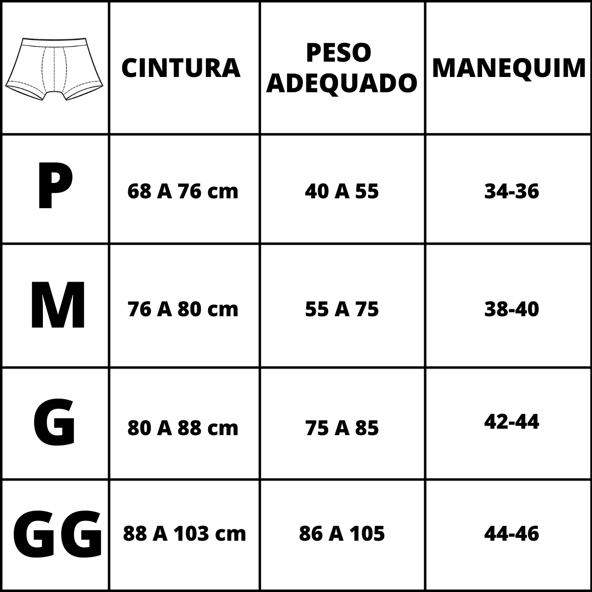 GG: Cintura: 88 a 103 cm / Peso: 86 a 105 kg / Manequim: 44-46